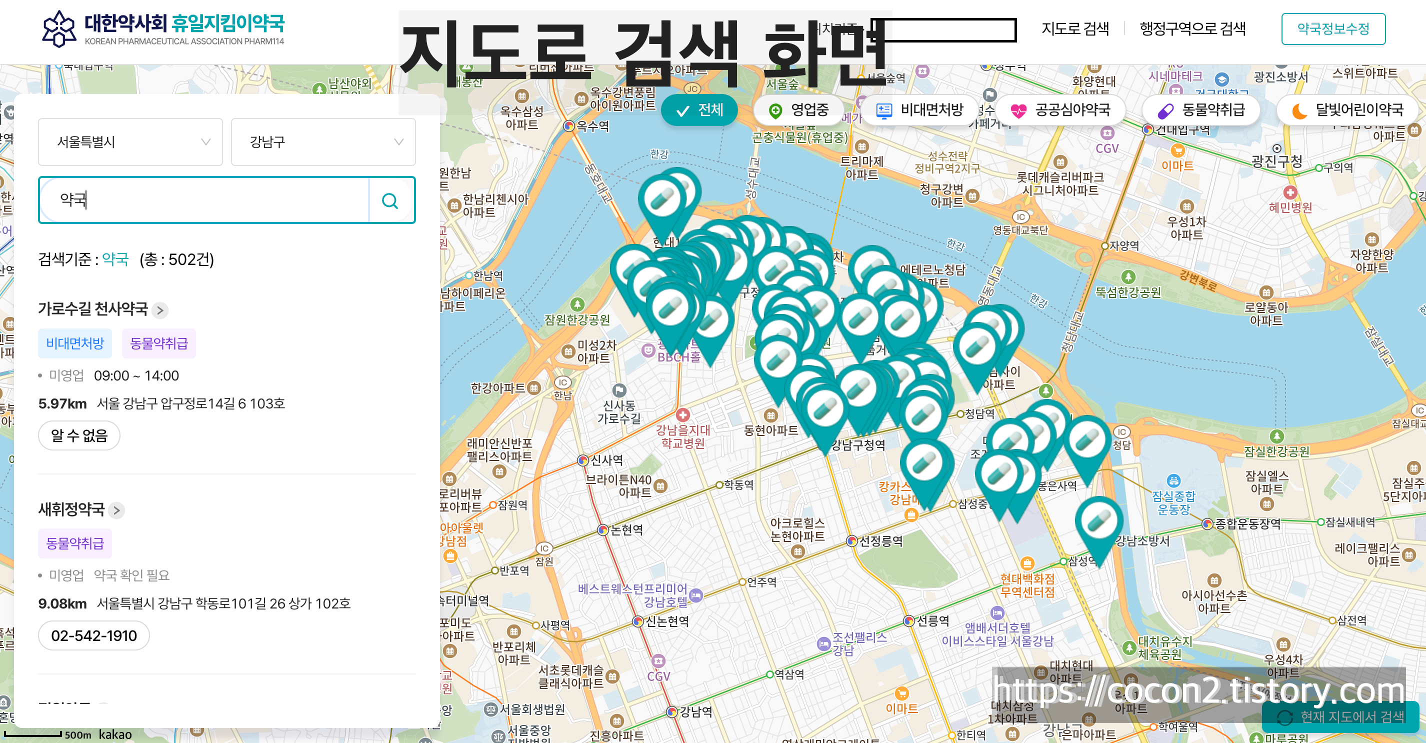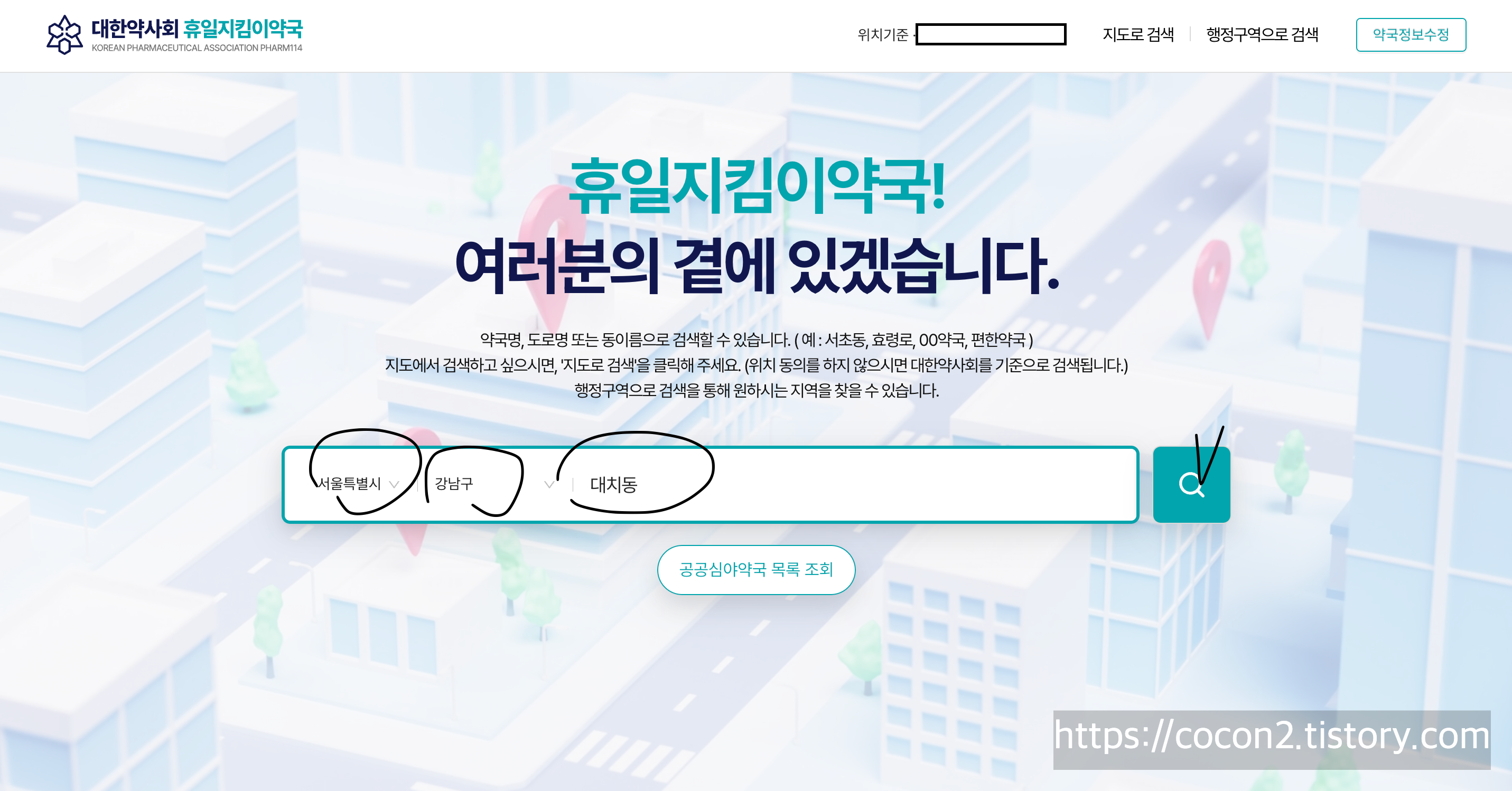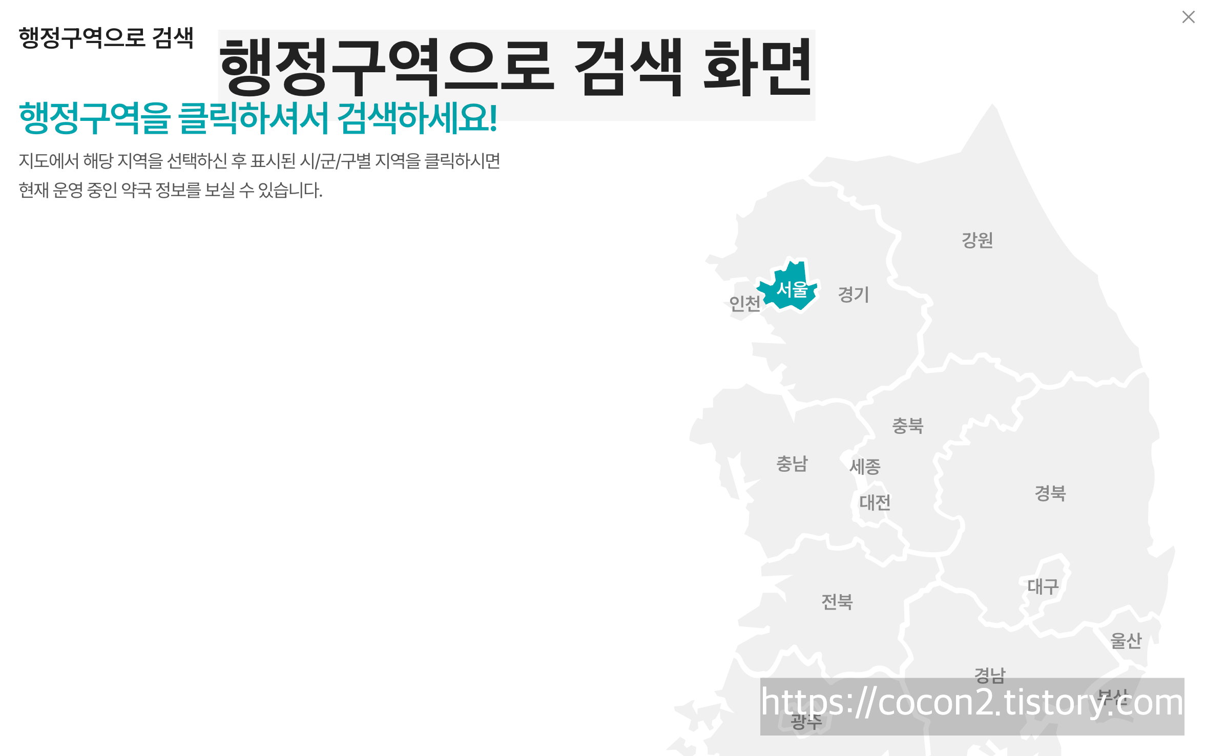 접속을 하셨다면, 약국명, 도로명 또는 동이름으로 검색할 수 있습니다. (예 : 효성동, 효성로, 00약국, 공소물약국), 지도에서 검색하고 싶으시다면, '지도로 검색'을 클릭하시면 됩니다. (위치 동의를 하지 않으시면 대한약사회를 기준으로 검색되는 점 참고해 주세요.) 마지막으로 행정구역으로 검색을 통해 원하시는 지역을 찾을 수 있습니다. 자세한 부분은 아래의 그림을 참고해 주세요.