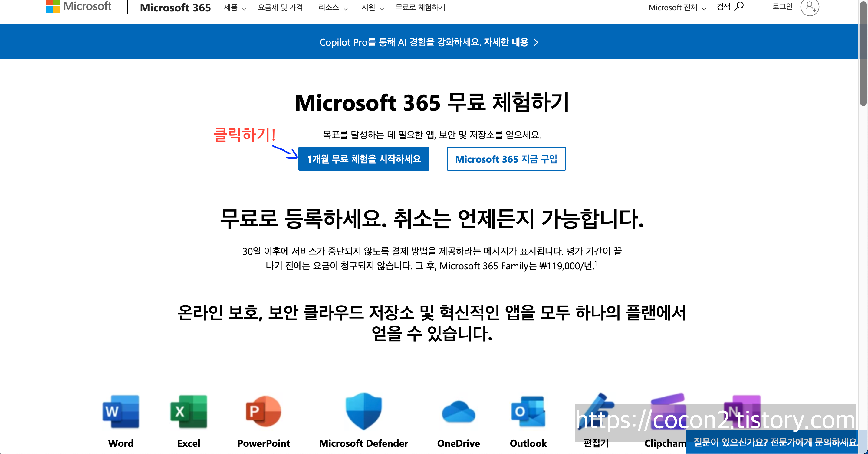 - Microsoft 365 Family 무료 체험 페이지에 접속합니다.