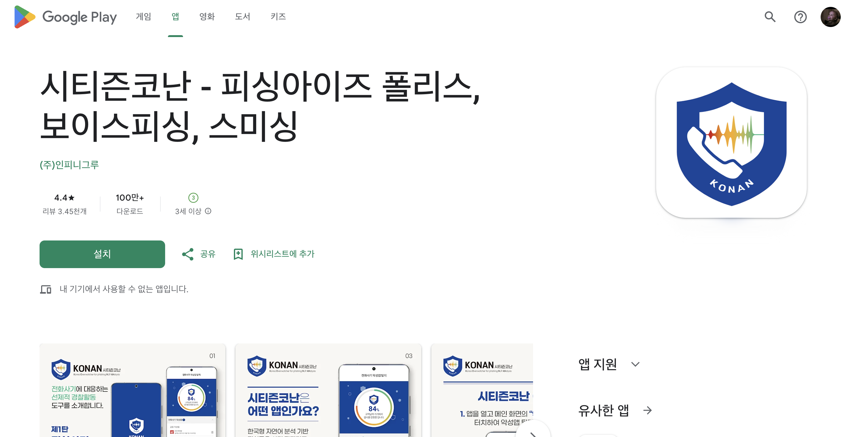 검색 결과에서 '시티즌 코난' 앱을 선택한 후, '설치' 버튼을 클릭합니다.